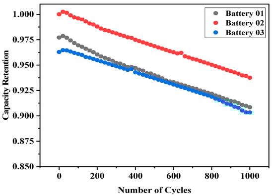 The results of the 1000-cycle aging test revealed distinct trends in capacity retention across the three battery cells. Coulombic counting was used to calculate the initial and remaining capacities relative to the nominal capacity of 3500 mAh. As presented in Figure 3, the capacities of all three batteries declined gradually over the test duration, with variations between the cells. After completing 1000 cycles, the remaining capacities for Battery 1, Battery 2, and Battery 3 were recorded as 90.76%, 93.76%, and 90.34%, respectively, as shown in Figure 3. These results demonstrate a consistent aging pattern while highlighting minor variations in capacity fading, likely due to intrinsic differences between the cells despite their identical specifications.