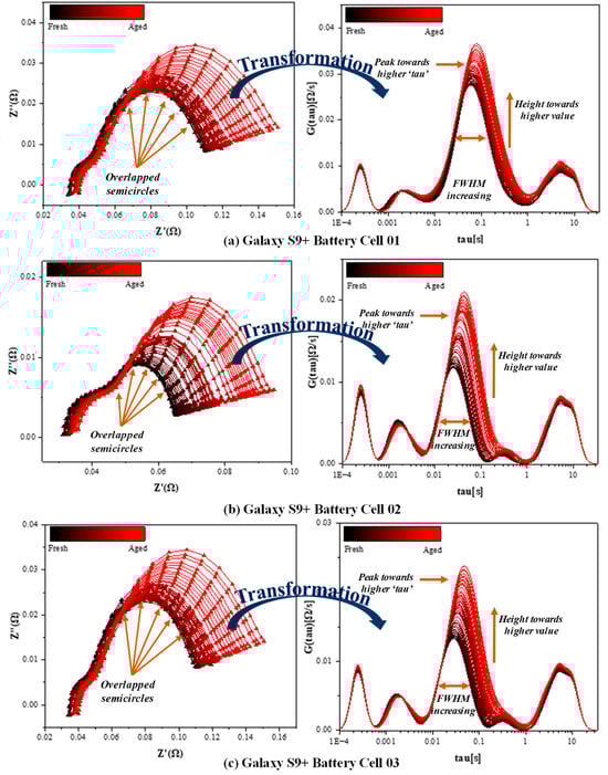 As shown in Figure 4 (right), in the DRT spectrum, the peaks moving left to right correspond to the ohmic resistance, Solid Electrolyte Interphase (SEI) layer resistance, charge transfer resistance (the primary focus of this work), and diffusion (Warburg impedance) at low frequencies. The charge transfer peak, which is the most dynamic feature of the spectrum, exhibits several clear trends with the cycling across all three cells. Firstly, the peak shifts to longer relaxation times (τ), indicating slower charge transfer processes as the battery ages. This shift reflects the growing resistance at the electrode–electrolyte interface and the declining efficiency of the ion transport. Secondly, the peak height increases noticeably, confirming a steady rise in resistive behavior due to material degradation and structural changes in the electrodes. Additionally, the FWHM (Full Width at Half Maximum) of the charge transfer peak widens over the cycling duration, suggesting increased heterogeneity in the electrode reactions and reduced uniformity in the material properties. The overall area under the charge transfer peak also increases significantly, underscoring the critical role of charge transfer resistance in the aging process and its direct correlation with battery degradation.