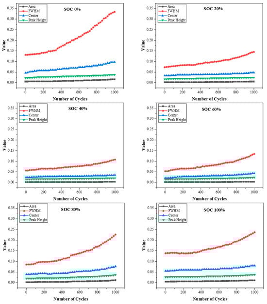 Figure 5 shows the evolution of key DRT-derived parameters, including the peak area, FWHM, center relaxation time, and peak height for the charge transfer peak in the DRT plots of Cell 01 over 1000 cycles at six different SOC levels. These parameters were extracted through the Gaussian fitting of the charge transfer peaks, ensuring a precise quantification. The results reveal consistent trends influenced by both the cycle number and SOC, reflecting the progression of battery aging mechanisms. As the battery ages, the charge transfer resistance, which dominates the mid-frequency region of the impedance spectrum, increases significantly.
