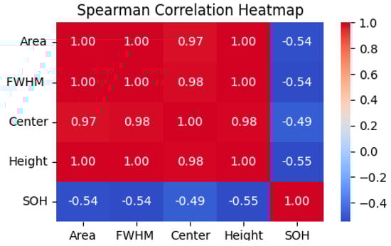 where di is the rank difference between the corresponding values of two variables, and n is the total number of observations. The analysis reveals a strong positive correlation among the DRT-derived parameters, indicating their collective representation of the same underlying charge transfer relaxation process. As the battery ages, these parameters demonstrate consistent trends, reflecting the gradual increase in the charge transfer resistance. In contrast, the correlation between the DRT parameters and SOH exhibits a consistent negative trend, with correlation coefficients ranging from −0.49 to −0.55. This negative relationship highlights the sensitivity of the charge transfer relaxation process to SOH degradation—as the SOH declines, the charge transfer resistance peak becomes more prominent, further emphasizing its importance as a reliable indicator of battery health.