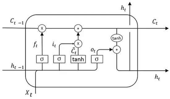 The Long Short-Term Memory (LSTM) model is a type of neural network designed for sequential data, with a unique memory feature that enables it to retain and update relevant information over time [21,22,23]. The architecture of an LSTM cell, as shown in Figure 7, comprises four key gates, the forget gate, input gate, cell state update, and output gate, which work together to manage the flow of information.