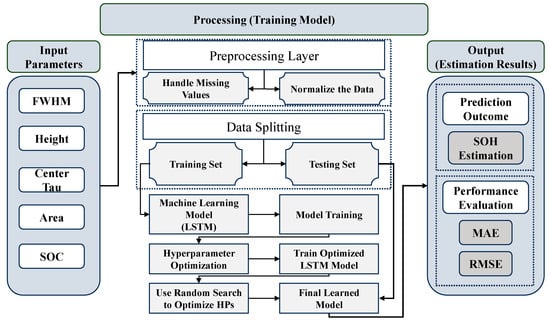 In this study, the LSTM model is trained as described in Figure 8. The process begins with the selection of key electrochemical features as input parameters, which include DRT parameters along with the SOC to cover the different state of charge applications. In the data processing stage, the input data undergo two critical preprocessing steps. First, any missing values are handled typically when the Gaussian fitting produced outliers that interrupted the smooth trend parameters, ensuring that the dataset is complete and reliable. Second, the data are normalized to bring all input features to a consistent scale between 0 and 1, which helps improve the convergence of the model during training. After preprocessing, the dataset is split with the ratio of 80% and 20% as a training set to train the model and a testing set to evaluate its performance, respectively.