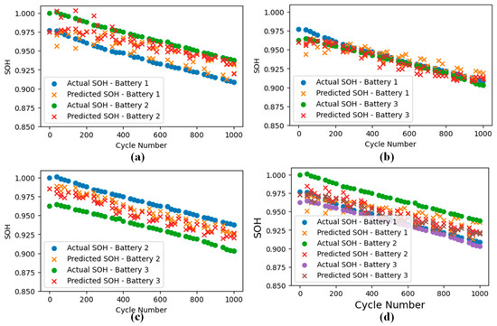 Figure 9 presents a comparison of the actual SOH and predicted SOH for these datasets. The results indicate that when the LSTM model was trained and tested with datasets from Battery 1 and Battery 3, the prediction accuracy was the highest. This can be attributed to the fact that the initial capacity difference between Battery 1 and Battery 3 is minimal, approximately 1%, resulting in smaller deviations and a closer alignment between the predicted and actual SOH. The performance metrics for this dataset were particularly impressive, achieving a Mean Absolute Error (MAE) of 0.58% and a Root Mean Squared Error (RMSE) of 0.70%.