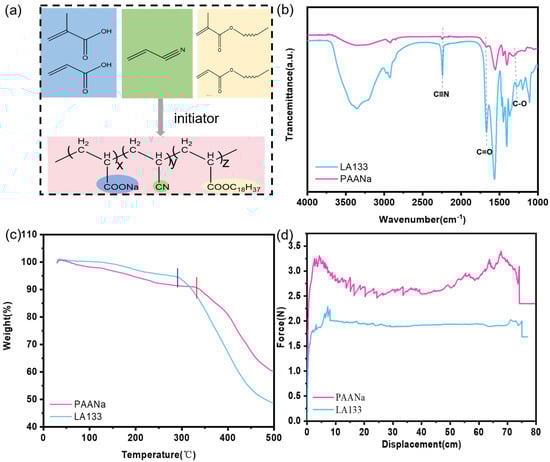 (a) Molecular structure of PAANa. (b) FT-IR, (c) TGA, and (d) Tensile test of PAANa and LA133.