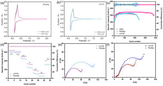 CV curves of (a) PAANa and (b) LA133. Cycling curves at room temperature (c) at 1 C and (d) at different rates. EIS (e) before and (f) after 180 cycles of PAANa and LA133.