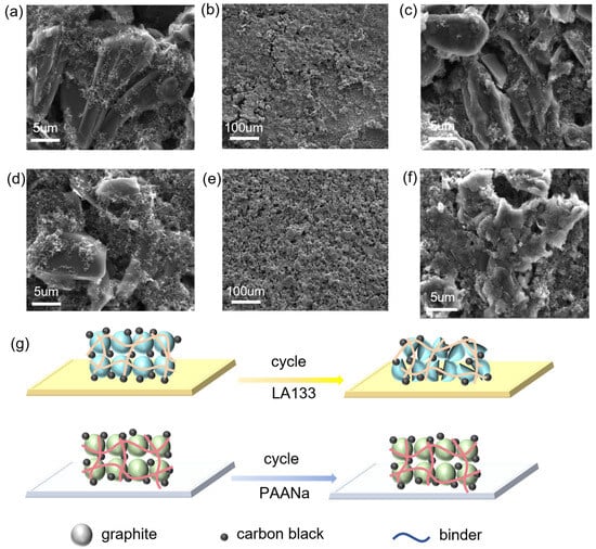 SEM (a) fresh, (b) high magnification and (c) low magnification after 180 cycles of graphite electrodes with PAANa; (d) fresh, (b,e) high magnification and (f) low magnification after 180 cycles of graphite electrodes with LA133. (g) Diagram of graphite internal circulation change.