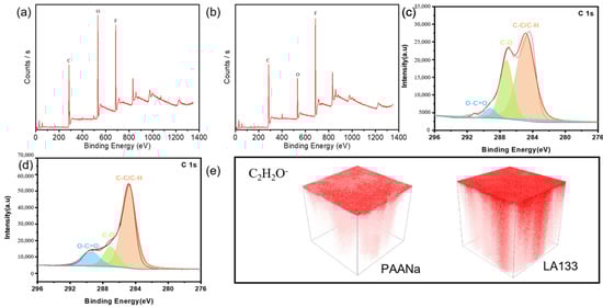 Lithium metal surface XPS of (a) PAANa, (b) LA133, (c) C 1s of PAANa, and (d) C 1s of LA133. (e) 3D renderings of C2H2O− distribution in the SEI formed on the LMA with PAANa and LA133.