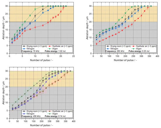 The drilling experiments were investigated to understand the laser–material interaction with regard to the ablation behavior. As illustrated in Figure 1, the ablation behavior of the lithium copper foils under investigation was examined for various process gases and water contents, as well as for different frequencies and pulse energies, respectively. It was observed that, at lower frequencies or with lower pulse energies the ablation behavior exhibited a reduced number of pulses required for a complete shot through when compared to higher frequencies or pulse energies. Furthermore, an increase in frequency to 285 kHz or 490 kHz led to an increase in the number of pulses required for a complete shot through. It is noteworthy that, as the frequency increases, the increase in ablation depth per pulse becomes more linear. This phenomenon is particularly evident in the context of thermally controlled ablations, where the accumulation of heat plays a pivotal role [15]. The investigation encompassed a range of process gases and water contents, with drilling under argon conditions demonstrating the minimum number of pulses required. Conversely, the synthetic air mixture with a water content >5 ppm necessitates the greatest number of pulses. The ablation behavior for the drying room atmosphere with a water content of 5 ppm and nitrogen exhibit a nearly equivalent range, considering the standard deviation. This observation can be attributed to the varying binding energies exhibited by the lithium compounds. The laser energy introduced in this process disrupts the lithium bonds, leading to the formation of a new bond with the surrounding gas components. Due to the temporal extent of the chemical reaction, which is measured in femtoseconds, bonds are broken, and new bonds are formed between each laser pulse.