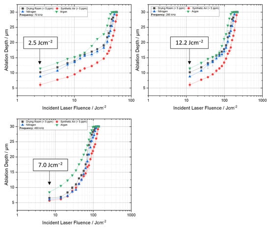 As illustrated in Figure 2, the ablation thresholds vary with both frequency and process gas. Generally, it can be observed that, under constant conditions, the process gases do not directly impact the fluence required for ablation. The ablation threshold for drilling at 70 kHz is 2.5 Jcm−2, at 285 kHz it is 12.2 Jcm−2, and for 490 kHz the necessary laser fluence is 7.0 Jcm−2. Other studies have demonstrated that the ablation threshold for a 50 µm lithium foil at a pulse duration of 261 ns and a frequency of 1 kHz was 35.5 Jcm−2 [4]. Consequently, the observed ablation thresholds appear to be within the expected range, as the ablation threshold generally decreases with higher frequencies [15]. However, this phenomenon was not observed in the present study. Furthermore, it has been demonstrated that the selection of process gases can indeed influence the ablation depth. This phenomenon has been previously documented by Elsied et al. in the context of aluminum and tungsten [21]. Notably, drilling under argon has been observed to result in a greater depth of drilling. This outcome is counterintuitive, as drilling under argon typically results in significant energy dissipation due to the plasma’s energy absorption characteristics, leading to a substantial reduction in available energy for material removal [22]. However, it is important to note that these observations are primarily applicable to pure materials and do not extend to composite foils or reactive alkali metals. The underlying mechanism pertains to the prevention of oxide layer formation at the surface, which in turn weakens the lithium bonds. This effect, despite the attenuation of laser energy by plasma formation, ensures sufficient energy for achieving substantial ablation depths.