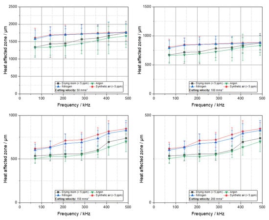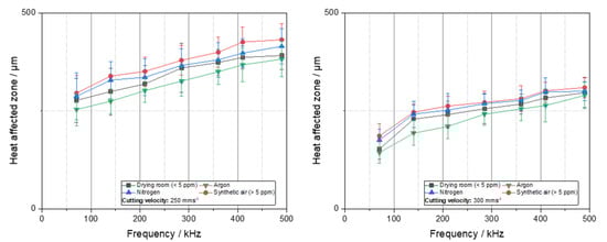 Heat-affected zone over frequency for the investigated process gases and different water contents by cutting under different cutting velocities (consider the different HAZ range).