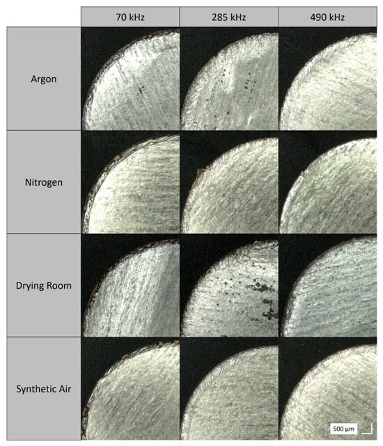The drilling test results demonstrate that drilling under argon necessitates the least energy to achieve complete shoot through. These findings are corroborated by the present data. At 70 kHz, argon exhibits a reduced number of free copper spots, indicating that even at low pulse overlap, the energy input is sufficient to remove the material. Conversely, the energy input required for synthetic air is considerably higher, resulting in insufficient energy to remove lithium and copper, and the presence of residual copper spots. The disparities in the cutting edges become indiscernible at higher frequencies. The drilling experiment results indicate that the number of pulses required for a complete shoot through is nearly similar at 285 kHz and 490 kHz. Furthermore, the pulse overlaps are more proximate at 285 kHz and 490 kHz than at 285 kHz and 70 kHz, thereby rendering the analogous cutting edge patterns contingent on the process gases more evident. Thus, for the evaluation of the heat-affected zone, it can be stated that there were no decisive differences with regard to the length of the heat-affected zone within the standard deviation; however, the appearance of the cutting edge differed depending on the process gas.