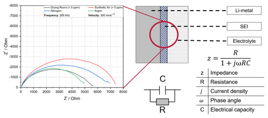 Electrochemical impedance spectroscopy of laser cut lithium copper foils (PR = 285 kHz, vc = 300 mms−1) under different process gases and atmospheres with different water contents.