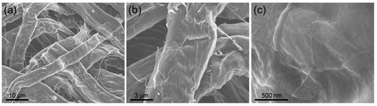Figure 1a presents a comprehensive SEM analysis of the synthesized hard carbon/graphene composites at progressively increasing magnifications. The hard carbon material exhibits a well-defined fibrous architecture, with individual fibers displaying 5–10 μm diameters. This distinctive one-dimensional morphology, characterized by intertwined carbon fiber networks, provides structural integrity and efficient ion transport pathways in the electrode material. At higher magnifications (Figure 1b,c), the fiber surfaces appear relatively smooth with occasional surface irregularities, suggesting the presence of nanoscale porosity and surface defects inherent to the hard carbon structure. The rGO incorporation was maintained at a deliberately low concentration. Consequently, the ultrathin graphene flakes were not directly resolvable in the SEM images due to their low concentration and the limited contrast between carbonaceous materials. Therefore, TEM further observed the nanostructure of the composite.