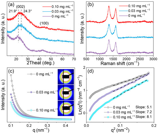 Further quantitative Porod analysis (Figure 3d) reveals a systematic increase in the slope magnitude in the high-q region with higher graphene concentrations. This enhanced positive deviation from Porod’s law signifies a significant transition in the interfacial structure between the hard carbon and graphene phases [30,31,32]. The observed trend suggests the development of a more defined, smooth boundary with reduced electron density fluctuations, consistent with the formation of a well-organized graphene-hard carbon interface. These spectroscopic and SAXS analyses and TEM observations confirm the successful formation of a stable two-phase interface comprising highly crystalline FLG uniformly coating the low-crystallinity hard carbon matrix.