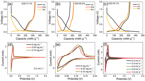 Charge–discharge curves: (a) 0.03 mg mL−1. (b) 0.1 mg mL−1. (c) 0 mg mL−1. CV curves: (d,e) different materials in 0.2 mV s−1. (f) different scan rates of 0.03 mg mL−1 sample.