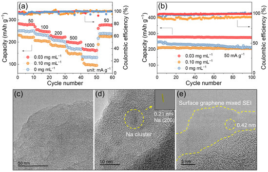 Electrochemical testing and microstructure after discharge: (a) Rating; (b) Cycling; (c–e) TEM images of 0.03 mg mL−1 sample after discharging to 0.01 V.