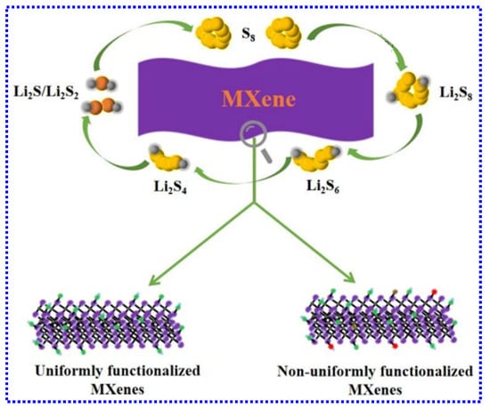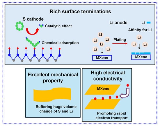 - Xiao, Z.; Li, Z.L.; Meng, X.P.; Wang, R. MXene-engineered lithium-sulfur batteries. J. Mater. Chem. A 2019, 7, 22730–22743. [Google Scholar] [CrossRef]