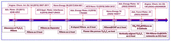 In this work, we first explore the preparation approaches of MXene, transitioning from conventional techniques to eco-friendly alternatives. We thoroughly evaluate how these methods impact the cost, energy efficiency, environmental sustainability, and structural characteristics of the resulting MXene. Subsequently, we review recent progress in the application of MXene as a cathode and anode host, as well as a functional interlayer or separator in LSBs (Figure 2), with a focus on the relationship between MXene’s surface chemistry and the energy storage performance of LSBs. The studies highlighted in Figure 2 collectively showcase the evolution of MXenes in LSBs, beginning with the discovery of Ti3C2Tx MXene in 2011. Early work demonstrated MXene’s potential as a conductive S host (2015) and as a separator coating (2016) to suppress polysulfide shuttling. Subsequent research explored MXene as a Li host (2017) and incorporated N-doping (2018) and porous architecture (2019) to enhance active material utilization and ion transport. Hybrid structures such as MXene@CNF (2020) and vertically aligned MXenes (2022) improved Li plating stability and ionic conductivity. Recent innovations include multifunctional composites like TiS2/TiO2@MXene (2023) and 3D TiN-MXene-Co@CNT networks (2024), which synergistically address conductivity, polysulfide retention, and structural stability. These advancements have progressively established MXenes as versatile and high-performance components for next-generation LSBs. Lastly, we propose future directions for MXene synthesis and discuss its potential for real-world applications in LSBs.