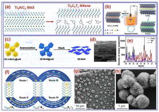 (a) Pictorial demonstration of water-free etching approach. Adapted from [], Copyright 2020, Elsevier B.V. (b) Preparation of MXene from the MAX phase by molten salt assisted electrochemical etching and the in situ modification of surface terminations. Adapted from [], Copyright 2021, Wiley-VCH. (c–e) Pictorial demonstration of preparation and DOS of 2D MoN. Adapted from [], Copyright 2017, American Chemical Society. (f) Pictorial representation of structural editing of MAX phases and MXenes using chemical scissor-mediated intercalation procedure. Adapted from [], Copyright 2023, The AAAS. SEM micrograph of (g) microspheres developing on carpets, and (h) individual microspheres. Adapted from [], Copyright 2023, The AAAS.
