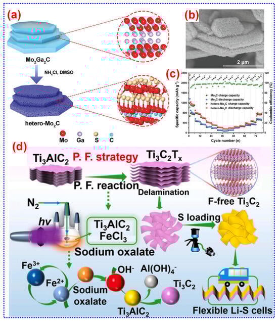 (a–c) Diagram illustrating the preparation and FE-SEM image of hetero-Mo2C and the cycle performance of hetero-Mo2C and Mo2C samples at 1 A g−1. Adapted from [], Copyright 2022, Wiley-VCH. (d) Pictorial demonstration of P.F. approach for the preparation of Ff-Ti3C2. Adapted from [], Copyright 2022, American Chemical Society.