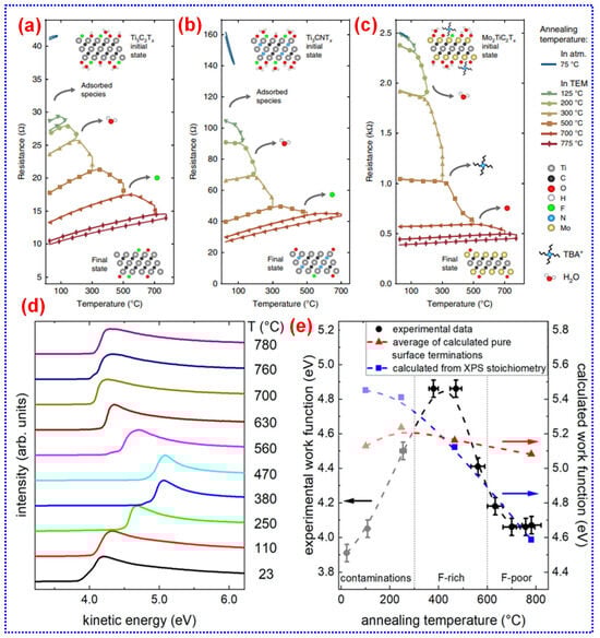 (a–c) Electrical response of MXene films to heat treatment. Adapted from [], Copyright 2019, Springer Nature. (d) Secondary electron cutoff (SECO) spectra of Ti3C2Tx after heat treatment at various temperatures. (e) Work function measurements of Ti3C2Tx with respect to temperature. Adapted from [], Copyright 2019, American Chemical Society.