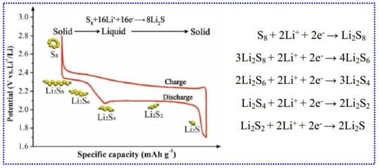 Figure 8 depicts the typical charge and discharge processes of LSBs in ether-related electrolytes. The entire reaction between Li and S is expressed as 2Li + S → Li2S. However, the actual conversion process between S and metal sulfides is more complex. At room temperature, elemental S exists as crown-shaped S8 rings, and the charge/discharge process implies the breaking and reforming of these S8 molecules. During this process, multi-stage LiPSs (Li2Sx, 1 ≤ x ≤ 8) are formed as intermediates []. Out of these intermediates, long-chain polysulfides (Li2Sx, 4 ≤ x ≤ 8) are greatly soluble in ether-related electrolytes. This high solubility has both advantages and disadvantages. On the positive side, it enables faster reaction kinetics due to liquid-phase reactions. However, it also leads to the undesirable shuttle effect, where dissolved polysulfides migrate between the electrodes, causing premature battery degradation. In contrast, short-chain polysulfides (Li2Sx, 1 ≤ x < 4) exhibit moderate solubility, reducing dissolution and shuttle-related issues. Nevertheless, their poor conductivity and slower kinetics, resulting from solid-phase reactions, hinder complete charge/discharge cycles. This limitation leads to reduced battery capacity, higher polarization, and diminished performance.