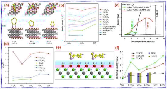 - Feng, J.; Liu, W.D.; Shi, C.; Zhang, C.Y.; Zhao, X.X.; Wang, T.; Chen, S.Q.; Li, Q.; Song, J. Enabling fast diffusion/conversion kinetics by thiourea-induced wrinkled N,S co-doped functional MXene for lithium-sulfur battery. Energy Storage Mater. 2024, 67, 103328. [Google Scholar] [CrossRef]