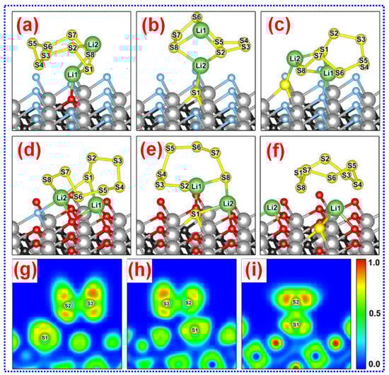 To overcome these challenges, scientists have developed various approaches to enhance the activity of LSBs. For S cathodes, C-based hosts like porous C [], CNTs [], and hollow C spheres [] have been engineered to entrap polysulfides within their nanopores. Nevertheless, the non-polar nature of C composites limits their ability to effectively immobilize polysulfides. To address this, polar host materials with strong chemisorption characteristics for LiPSs have garnered significant interest. These include heteroatom-doped carbons (for instance, B-doped [] and N-doped []), metal oxides and sulfides [,], MXene [], and GO [], have gained significant attention. For Li anodes, various strategies have been explored to stabilize the Li/electrolyte interface and adjust Li deposition. These include the use of electrolyte additives, 3D current collectors, protective physical layers, and solid electrolytes [].