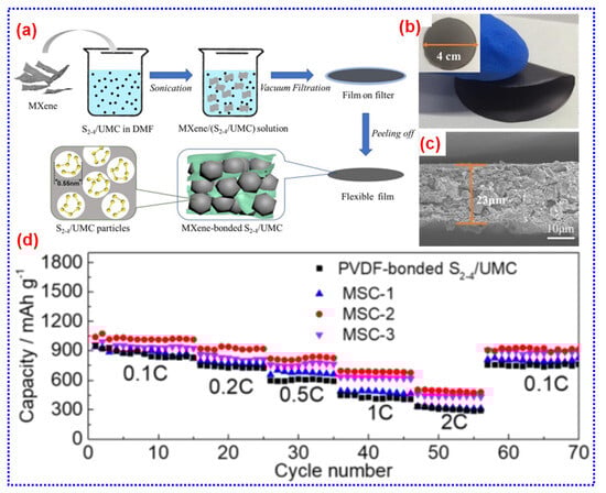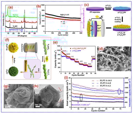 - Chen, Z.; Yang, X.B.; Qiao, X.; Zhang, N.; Zhang, C.F.; Ma, Z.; Wang, H.Q. Lithium-ion-engineered interlayers of V2C MXene as advanced host for flexible sulfur cathode with enhanced rate performance. J. Phys. Chem. Lett. 2020, 11, 885–890. [Google Scholar] [CrossRef]