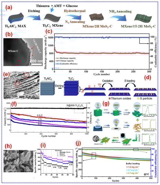 - Nguyen, V.P.; Qureshi, Y.; Shim, H.C.; Yuk, J.M.; Kim, J.H.; Lee, S.M. Intercalation-Conversion Hybrid Cathode Enabled by MXene-Driven TiO2/TiS2 Heterostructure for High-Energy-Density Li-S Battery. Small Struct. 2024, 5, 2400196. [Google Scholar] [CrossRef]