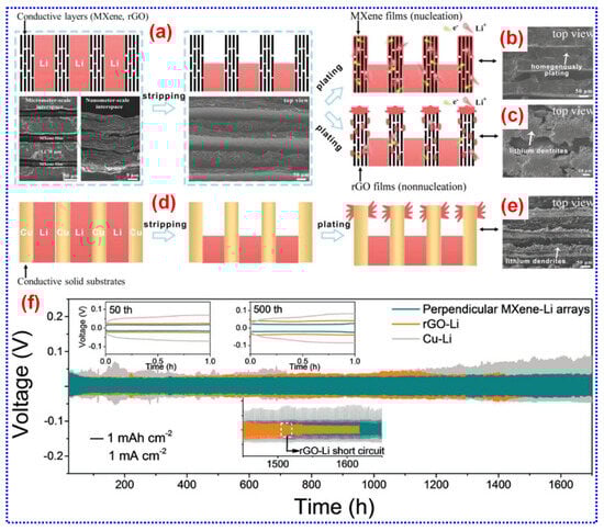 - Cao, Z.J.; Zhu, Q.; Wang, S.; Zhang, D.; Chen, H.; Du, Z.; Li, B.; Yang, S. Perpendicular MXene arrays with periodic interspaces toward dendrite-free lithium metal anodes with high-rate capabilities. Adv. Funct. Mater. 2020, 30, 1908075. [Google Scholar] [CrossRef]