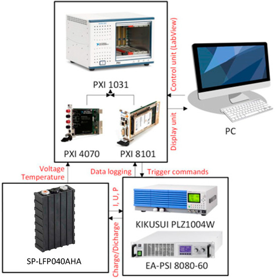 The two components of this system are a programmable source and a programmable load. Figure 2 shows the battery’s electrical identification system scheme. The LabVIEW (fy National Instruments) environment was used to construct the algorithm for these devices, which includes adjusting the voltage, current, and power parameters for charging and discharging. The cells’ temperature is simultaneously tracked, and if it rises too high, it is turned off. Two cards, PXI 4070 and PXI 8101, are connected to PXI 1031, which solves the control. A highly accurate multimeter is the PXI 4070 measuring card. The voltage on the cell and the voltage changes on the thermistor, a thermal sensor, are both monitored by this card. The PC and the load/source are connected via the PXI 8101 control card. This card has a serial connection with a programmable source and load, USB ports for a mouse and keyboard, and an HDMI port for attaching a screen. This serial communication is used to control these programmable devices. The cells are immediately connected to these gadgets, which are attached to a lockable cabinet. Using the observed current, the program can determine the battery’s capacity directly. This system has been modified to record measured values even when the battery is being charged, discharged, and unloaded. When charging or discharging, the algorithm has the ability to pause. When deciding on the EEC parameters, these pauses are crucial. These pauses allow us to measure the electrochemical cell’s regenerated voltage, which we can then use to calculate the open-circuit voltage (OCV).