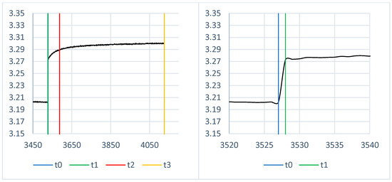 Five values make up the measured data, and they are recorded once every second. The cell voltage, temperature, and current passing through the cell are the measured parameters; the current power is computed using these data. The final value is determined by the algorithm. This represents the capacity that is currently charged or discharged. Every second, these five values are updated and recorded. These values serve as the foundation for all characteristics. It is essential to precisely document the electrochemical cell’s voltage recovery process when taking measurements with pauses. The regeneration time and the voltage differential before and after regeneration at specific intervals are then calculated by analyzing these pauses. The time constants required to determine the parameters of the analogous circuit are displayed in Figure 5, where t0 is the time before the battery discharge, t1 is the time in seconds following the termination of the load, t2 is the regeneration time 60 s following the termination of the load, and t3 is the time after 600 s [24]. The cell will be loaded in one second at this point. The internal resistance of the cell is determined by the voltage differential between t0 and t1. The voltage V0 (1) represents this. This is represented by the parameter RS in Formula (4) for the EEC. The fast and slow time constants are represented by the voltage difference between t1 and t2 and the voltage difference between t2 and t3. The voltages V1 (2) (fast) and V2 (3) (slow) stand for this. In Formulas (5) and (7), the parameters of the equivalent circuit C1 and R1 stand in for the fast time constant. In Formulas (6) and (8), the quantities C2 and R2 stand in for the slow time constant. There were always pauses after 5% of the specified cell’s SoC. Depending on the change in SoC, it is feasible to ascertain how the parameters of the corresponding electrical circuit alter.