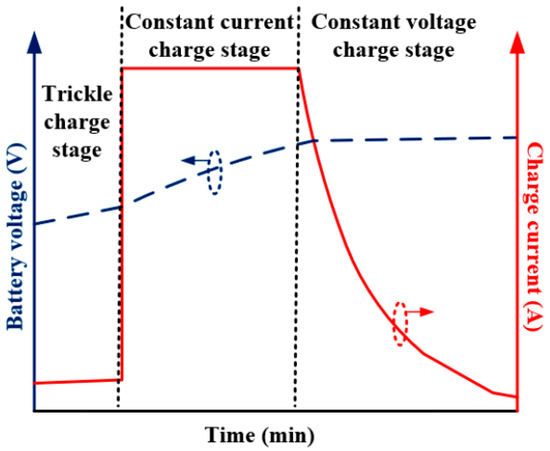 The charging and discharging of the cell is referred to as cell cycling. A single cycle represents a single cell charge and discharge. Only one type of cell was used for testing because cycling cells with larger capacities takes a lot of time. The SP-LFP040AHA cell was specifically cycled. A programmable load and a programmable power source were used to cycle, specifically, the EA-PSI 8080-60 power supply and the KIKUSUI PLZ1004W programmable load. Setting the maximum charging voltage to 3.65 V allowed for cycling. The discharge was stopped when the minimum cell voltage for discharging was set to 2.5 V. 60 A was the same current used for both charging and discharging. The process for evaluating the EEC parameters was applied to the cell prior to cycling. The cell was cycled 25 times after these parameters were established. The process for evaluating the parameters of the new electrical circuit was repeated after 25 cycles. The cell was then cycled 25 times more. The discharging process was realized with the constant current discharge (60 A), while the charging process was performed with the CC/CV profile (Figure 6).