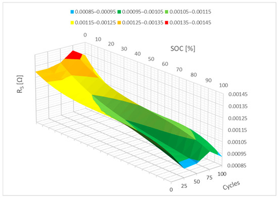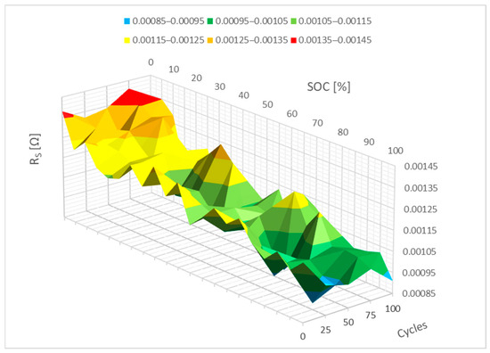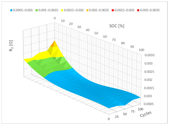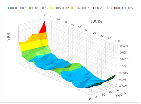 The path of the mathematical representation of the measured data from Figure 11 can be observed in Figure 12, just like with the prior parameters. Specifically, it is parameter R2 in this particular case. It is easy to see how parameter R2 differs in this 3D graph. It is evident when cycling that the 0–10% SoC interval is crucial, similar to how it is for parameter R1. Here, it can be presumed that the largest change will occur with additional cycles.