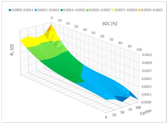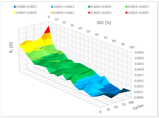 Figure 9 shows the cycling-induced change in parameter R1. This graph illustrates how parameter R1 evolved between 0% SoC and 10% SoC. It is obvious from this that the sector parameter R1 is greater than it was prior to cycling. Here, it is possible to predict how more cycling will affect the value of parameter R1. It is assumed that this parameter will change the most between 0% and 20% SoC.