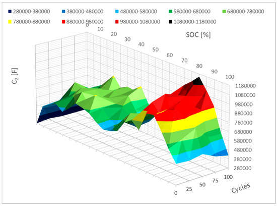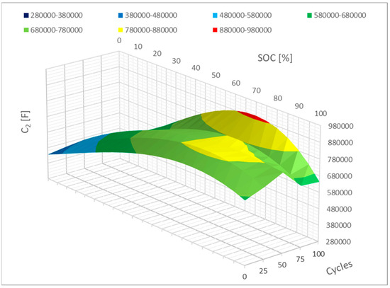 Similar to the R parameters, the C1 parameter can also be represented mathematically, as in Figure 14, which shows how the C1 parameter changed. In this case, a drop in the 0–20% SoC interval can be seen. It is also feasible to see a change in the interval between 80 and 100% SoC with this C1 parameter; in this case, there is a minor increase. Therefore, it is reasonable to think that these changes may intensify if the cell cycles further.
