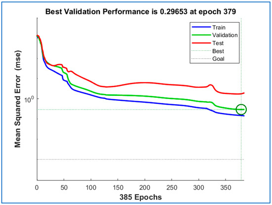 Original curves of the dependence of the error function (mean square error) on the iteration (epoch) in the learning process of the neural network in the Matlab R2021 environment. The images show color-coded waveforms within the training (blue color), testing (red color), and validation (green color) sets.