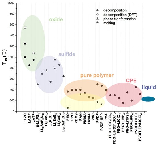 135]. For oxide SEs (green background) and sulfide SEs (blue background), Tts is the phase transformation temperatures at which impedance decreases or increases. For polymer SEs, the thermal decomposition of polymer-based composite electrolytes deals with the thermal stability of the polymer materials and additives. The thermal decomposition temperatures of neat polymers (orange background) and polymer composite materials (yellow background) are thus given for reference. For polymer-based all-solid-state lithium-ion batteries, the internal short circuit, and resultant thermal decomposition of the battery, are provoked by the melting of the polymer.