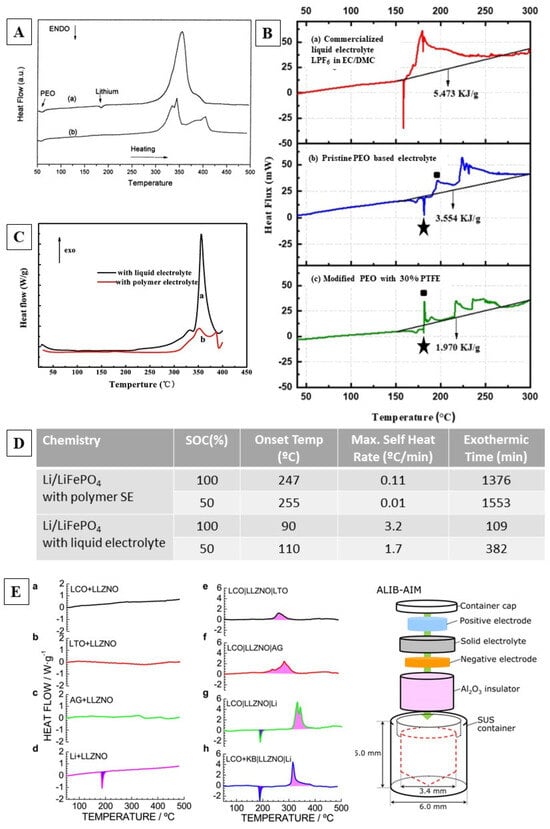137]. Differential scanning calorimetry DSC curves of polymer LIBs indicate that two peaks at 315 and 407 °C show up, which could be attributed to the reactions between polymer SEs/active material, and composite anode decomposition, respectively. The liquid electrolyte has two endothermic peaks as a result of the melting of PEO and lithium metal. The exothermic reaction of liquid electrolyte stems from a chain reaction, beginning from the gas release of the composite cathode and the sequential reaction with the lithium metal anode. It is important to realize that the heat produced in the liquid electrolyte is two times that of the total heat produced in polymer LIBs. Thus, the battery with polymer electrolyte displayed thermal stability with lesser heat generation. Additionally, Jokhakar et al. studied the same anode to do a comparison with the liquid electrolyte with polymer ASSLIB, and reported that SEs generated less heat than the liquid electrolyte [