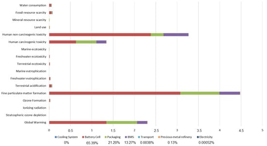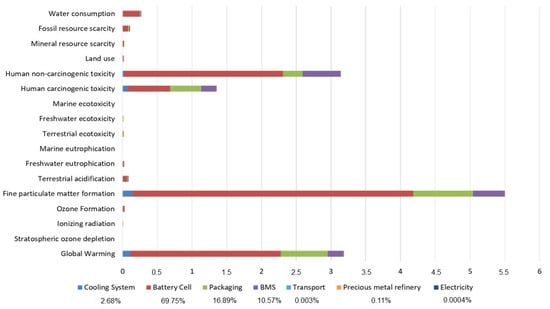 Figure 9 displays the environmental impacts of the two battery packs, NMC 811 and LFP. They represent the impact of each component of the battery on the associated impact category. This presentation helps us to understand which component contributes the most to a particular impact category. For instance, it is possible to observe that the battery cell has the highest environmental impact in the global warming category for both battery packs. The percentages were calculated by considering the total impact of each component in all impact categories. Thus, it is possible to see that 69.74% of the impacts come from the battery cell in the NMC 811 battery and 65.39% in the LFP ones. Furthermore, from