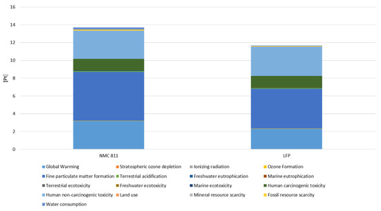 146] were utilized in the research. The literature determines that the production of the cathode in NMC 811 batteries is responsible for the most critical environmental effects. This is primarily due to the availability of essential materials such as nickel and cobalt. Mining and processing activities related to these elements contribute considerably to the environmental impact of the battery system as a whole [