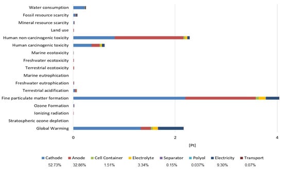 Figure 10 shows that 52.73% of the impacts come from the cathode and 32.86% from the anode, proving these are the components with higher environmental impacts.