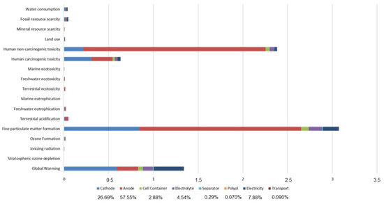150]. These studies found that, similarly to NMC batteries, the cathodes in LFP batteries also have high environmental impact, most likely due to lithium hydroxide. Additionally, the anodes in both types of batteries have relatively high environmental impacts because of the copper present in the negative current collector [