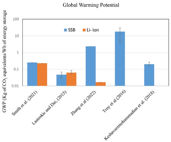 Observed numerous life cycle assessment (LCA) study results reveal the outcomes to be significantly reliant on several factors, like energy requirements and material availability during the manufacturing. Such reliance involves considerable uncertainty, particularly if the studies were conducted at the laboratory scale. Among different environmental metrics, global warming potential (GWP) is generally used due to being technologically comparative as well as comparable between research. For highest consistency, the studies are normalized by a reverse engineering procedure where GWP impacts are converted into a common functional unit—specifically, 1 Wh of energy storage capability. Normalization enables the consistent and coherent comparisons of battery technologies. The relative assessment of GWP between solid-state batteries (SSBs) and conventional lithium-ion batteries is shown in