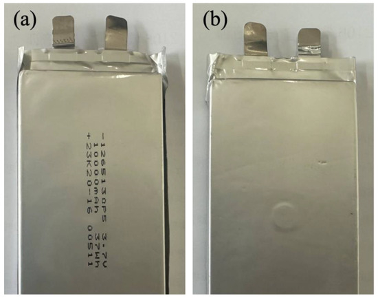 The battery sample chosen for this experiment is a square pouch battery with a cathode made of LiNixCoyMn1−x−yO2 and an anode composed of graphite. The battery is designed to be able to cycle over 1000 times, and the electrolyte of the battery consists of lithium salts and a polymer matrix. The nominal battery voltage is 3.7 V, the charge cut-off voltage is 4.2 V, and the discharge limit voltage is 2.8 V. Its overall dimensions are 132 × 65 × 13.5 mm. The physical diagram of the battery is as shown in Figure 1.