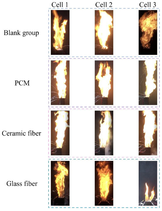 The three materials selected in the experiment all have the potential to suppress TRP, and their mechanisms for suppressing TRP are not completely the same. For the PCM, during the phase change process, it can absorb a large amount of heat, effectively suppressing the rise in battery temperature and thus achieving the purpose of suppressing TRP. Ceramic fiber is an excellent thermal insulation material. It can effectively prevent the heat of the TR battery from spreading to the surrounding batteries, thereby suppressing TRP. Glass fiber also has good thermal insulation performance. At the same time, due to its high porosity, while suppressing heat conduction, its structure with high porosity restrains the gas flow, and the low thermal conductivity reduces the heat transfer in the gas, effectively suppressing the occurrence of thermal convection. All these characteristics endow glass fiber with the potential to suppress TRP. In order to compare the effect of TRP suppression by the three materials more intuitively, we compared the experimental phenomena during the TRP suppression process. Figure 3 shows the typical experimental phenomena of cell 1, cell 2, and cell 3 during the TRP process of the blank group, as well as the three materials of 3 mm, respectively. It can be clearly observed that only the 3 mm glass fiber successfully inhibited the TRP of cell 3. The other three groups did not inhibit the TRP of cell 3. Overall, there was no significant difference in the flame behavior of the cells, except for cell 3 of the 3 mm glass fiber set. This is because the three materials themselves cannot directly act on the flame; they can only play a role as a flame retardant but cannot mitigate the intensity of the flame directly. A PCM can absorb heat and dissipate heat in the process of phase change, but due to its inability to insulate the heat, it is unable to successfully inhibit the TRP at a thickness of 3 mm. Ceramic fibers and glass fibers have a good ability to insulate heat. However, from the experimental phenomenon, compared to the glass fiber, the ceramic fiber failed to inhibit the violent flame jet of cell 3 as successfully as the glass fiber. The success of the glass fiber in inhibiting the TR of cell 3 may be attributed to the better mechanical and insulating properties of glass fiber. This allowed the glass fiber to not only act as a thermal insulator but also provide some cushioning and insulation during the expansion process of the pouch cells. This avoided the occurrence of short-circuiting between neighboring cells, which prevented the TR of cell 3 from bursting into flames, resulting in only a small fire emanating from cell 3.