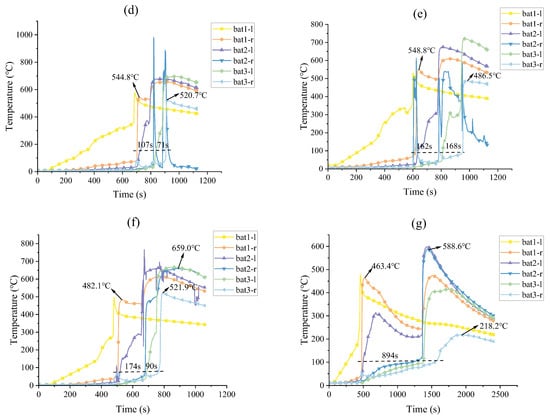 Comparison of battery module temperatures: (a) blank group, (b) 2 mm PCM, (c) 3 mm PCM, (d) 2 mm ceramic fiber, (e) 3 mm ceramic fiber, (f) 2 mm glass fiber, (g) 3 mm glass fiber.