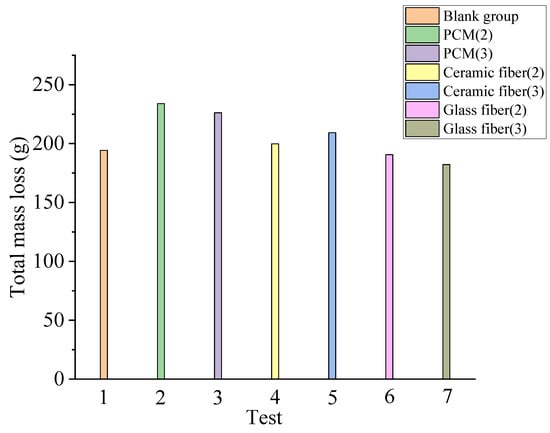 We have analyzed the mass loss of the battery module and discuss it in the following section. Figure 5 summarizes the total mass loss of the battery module for several cases. Compared with the 194.3 g of the blank group, the mass loss of the PCM group increased to 233.9 g and 226.2 g, respectively, which may be due to the loss of PCM by phase change melting when encountering high temperatures. The 3 mm thick PCM provides relatively better heat absorption and insulation, reducing the intensity of TR, which makes the total mass loss of the battery module slightly lower than that of the 2 mm PCM group at this time. The ceramic fiber mass loss in both thickness cases is higher than that of the blank group, 199.8 g and 209.3 g, respectively, even though it is more effective in suppressing the TRP of the battery module than both PCM groups. This may be due to the unstable chemical composition of the selected ceramic fiber materials, which led to the thermal decomposition of the materials and increased mass loss during TR. Through a thorough analysis of the experimental process and results, it was found that the layered stripping of aluminum silicate ceramic fiber paper at high temperatures is one of the main reasons for the decline and even failure of its barrier performance. When the ceramic fiber paper is exposed to a high-temperature environment, the internal fiber structure will undergo a series of changes. Under the action of high temperatures, the binding force between the fibers inside the ceramic fiber paper gradually weakens, and the originally closely arranged fiber layer begins to separate, forming the phenomenon of layered peeling. This is because ceramic fiber paper is usually made of fibers that are combined with each other by physical or chemical interactions. At high temperatures, these binding forces are disrupted and the friction between the fibers decreases, leading to easy separation of the fiber layer. Layer stripping will make the structure of ceramic fiber paper become loose, forming many gaps inside, thus greatly reducing its ability to block heat and gas. Heat can be transferred more easily through these voids, and the gas generated by TR can penetrate the ceramic fiber paper more smoothly, resulting in the TR transmission being unable to be effectively suppressed. The total mass loss of both glass fiber groups is smaller than that of the blank group, 190.6 g and 182.2 g. On the one hand, this is attributed to the good thermal stability of the glass fiber material itself. On the other hand, the good thermal insulation of the glass fibers reduced the intensity of TR, even at 3 mm, inhibiting the fierce ejection of cell 3. This resulted in a minimum mass loss of 182.2 g in the battery module with 3 mm glass fiber.