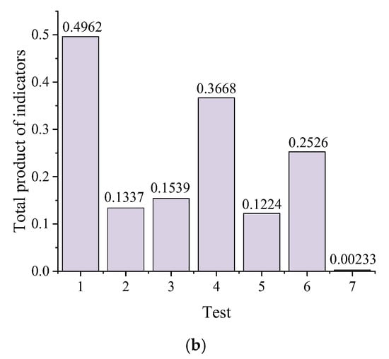 The evaluation model data are shown in Figure 6a. We can clearly see that the total area of 3 mm glass fiber is the smallest. This indicates that the riskiness of the battery module under the action of 3 mm glass fibers is the smallest, i.e., the effectiveness of 3 mm glass fibers in suppressing TRP is the best. In order to visualize these areas, we use the value of the product of the five metrics as the final metric that qualitatively represents the effectiveness of the material to inhibit TRP. The smaller the product, the more effective the material is in inhibiting TRP. As we can see from Figure 6b, all the materials have smaller indices than the blank group, proving that the inhibition is all positive. Especially, the value of 3 mm glass fiber is only 0.00233, which is much smaller than the other materials. It is proved that the 3 mm glass fiber group attained the best ability in inhibiting TRP. Overall, the effectiveness of TRP inhibition is, in descending order, 3 mm glass fiber, 3 mm ceramic fiber, 2 mm PCM, 3 mm PCM, 2 mm glass fiber, and 2 mm ceramic fiber. In practical applications, the cost and weight of the materials also need to be taken into account. As can be known from the above evaluation, the glass fiber has the best effect in inhibiting TRP, and its manufacturing cost is lower than that of the aluminum silicate ceramic fiber, but it is heavier than the aluminum silicate ceramic fiber. Therefore, it is suitable for application in fixed-energy storage systems. For mobile battery packs, such as the battery packs in electric vehicles, considering the factor of weight, ceramic fiber is more suitable for application in this scenario. However, compared with glass fiber, the effect of ceramic fiber in inhibiting TRP is not good, and it is necessary to make a trade-off between safety and cost at this time. For the PCM, its thermal management performance is the most excellent. However, it has a high cost, a high density, and the effect of inhibiting TRP is not good. Therefore, when choosing it, it is recommended to use it in combination with thermal insulation materials.